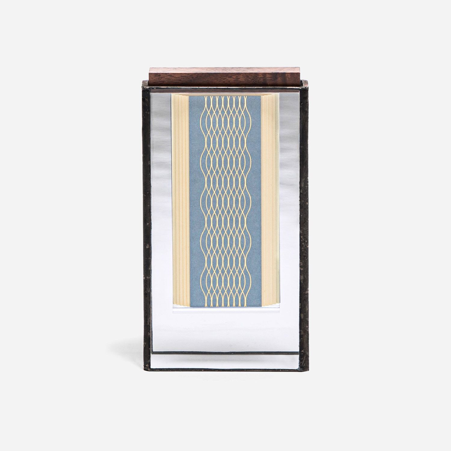 水面の揺らぎのような表情を持つキャセドラルガラスを背景に、専用の過去帳「しおり」を浮かして安置できます。過去帳のほか、写真立てや御本尊、札板2枚で夫婦位牌にすることもでき、またそれらを複数並べるなど手元供養をお求めのカタチにかなえることができます。