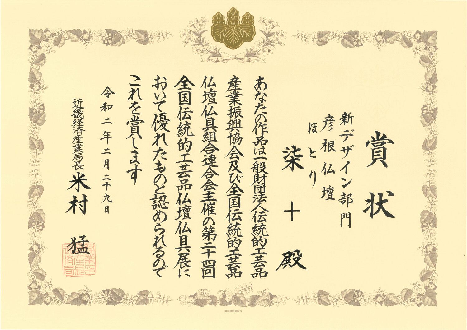 全国伝統的工芸品仏壇仏具展 新デザイン部門にて、「近畿経済産業局長賞」した彦根の逸品です。